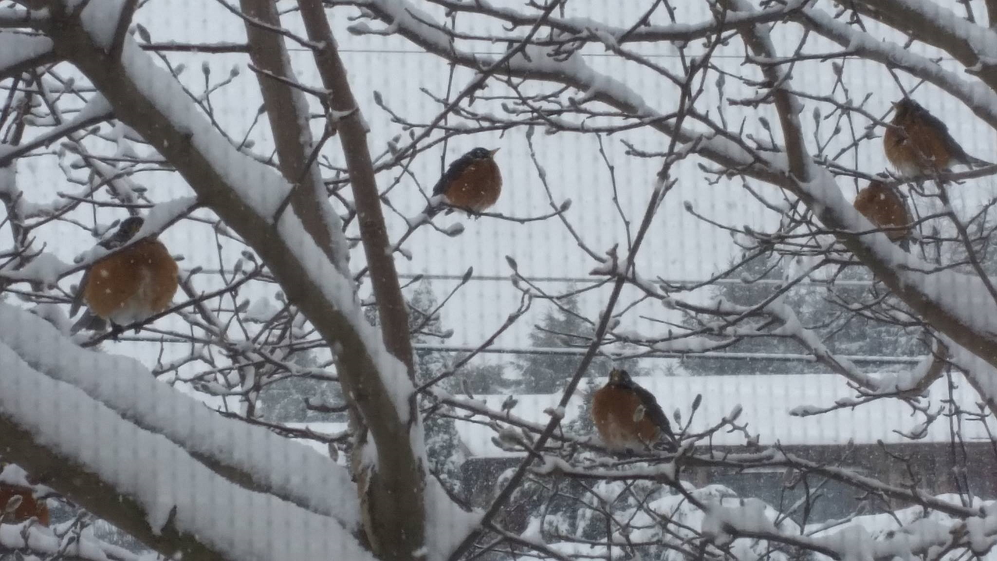 Although I wouldn’t have known it last Thursday, when seven inches of snow fell. Dozens of robins rode out the snowstorm on our front porch, in our magnolia tree, our garden, and as we discovered yesterday, in front of our garage doors.