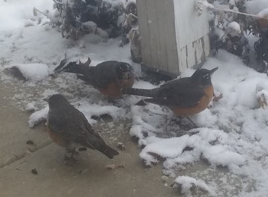 I’d never seen robins that fat before. I didn’t even know they were robins, but I posted this picture and another on Facebook, and people told me they were robins. I also Googled, and found pictures of fat robins. Evidently, they puff up when cold. I was wondering if that helped protect their organs from freezing.