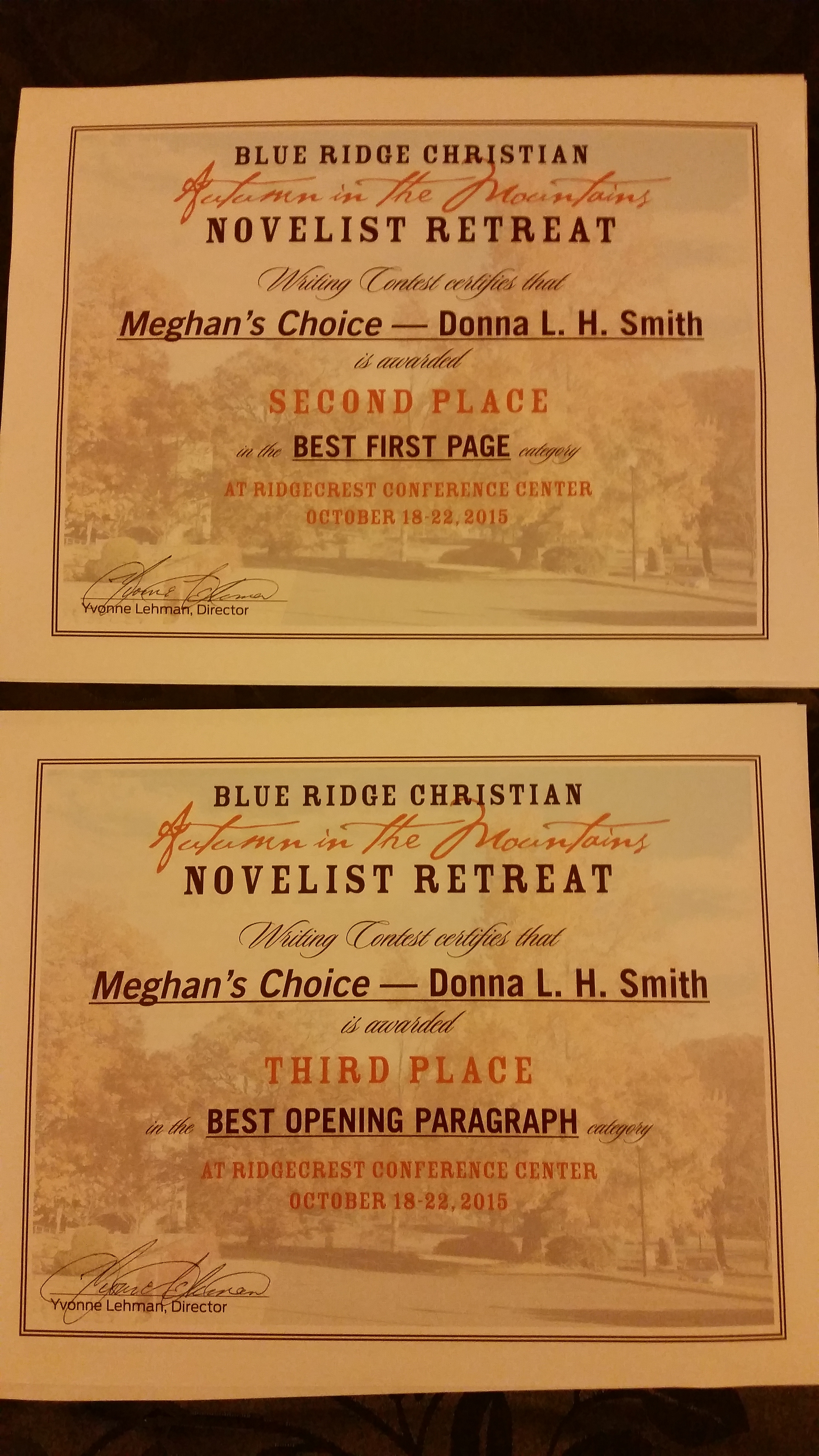 PrizesAbout three weeks before the retreat, I received an email stating that the submission deadline for the contests had been extended. I hadn’t thought much of entering, which gave certificate prizes for Best Title, Best First Line, Best Opening Paragraph, Best First Page, Best Book Proposal, and the Golden Leaf Award, for the best unpublished complete manuscript. I was busy getting together things for the writer’s conference I’m involved in, the Keystone Christian Fiction Writers Conference for early November. But since the extended deadline was easily within my grasp. Almost on a whim, I entered in three categories: 1) Best Opening Paragraph 2) Best First Page and 3) Golden Leaf Award.