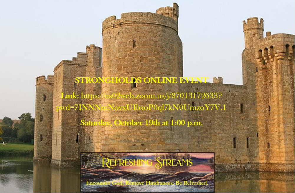 Refreshing Streams’ last online event for 2024 is Saturday, October 19, at 1:00 p.m. The subject is STRONGHOLDS. Hope to see you there! As always, we have extended ministry time after the teaching and questions, where you will identify and tear down your strongholds. We will have a downloadable handout available for you to keep and pass along to others if you wish.